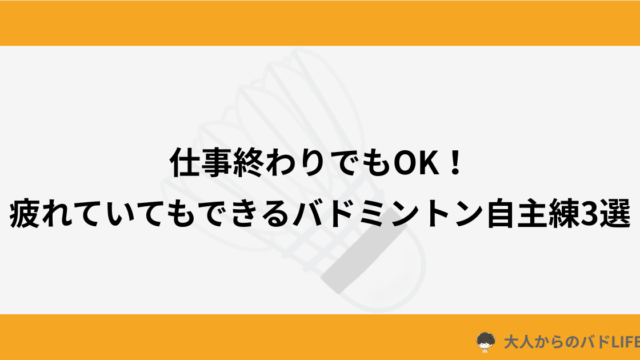 仕事とバドミントンの両立 仕事終わりでもOK!疲れていてもできるバドミントン自主練3選 2025年10月20日 badrin 大人からのバドLIFE 残業終わりはクタクタ… 練習したいけど、体育館まで行くのもしんどい でも少しでも上達したい! 社会人バドプ …